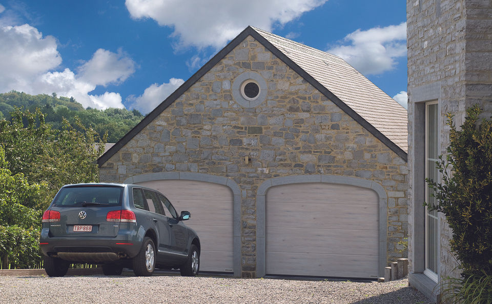 Sectional garage doors open vertically upwards and are suspended under the ceiling to save space. This construction principle means you can make full use of the space inside and in front of the garage. Sectional garage doors can be fitted in any garage opening and offer extra passage width.